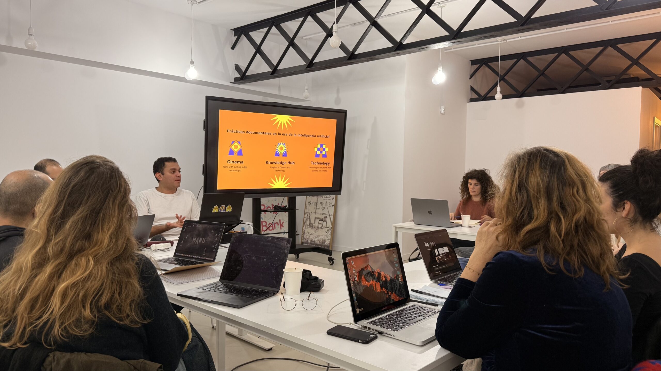 Durante una jornada intensiva, Camilo Restrepo y Jorge Caballero condujeron este taller dedicado a explorar los cruces posibles entre el archivo documental y la inteligencia artificial. Restrepo, especialista en 16mm y en la textura analógica del cine, y Caballero, experto en IA aplicada al documental, propusieron un encuentro poco habitual: unir la materialidad del cine clásico con la potencia de las nuevas herramientas generativas en una sola sesión.